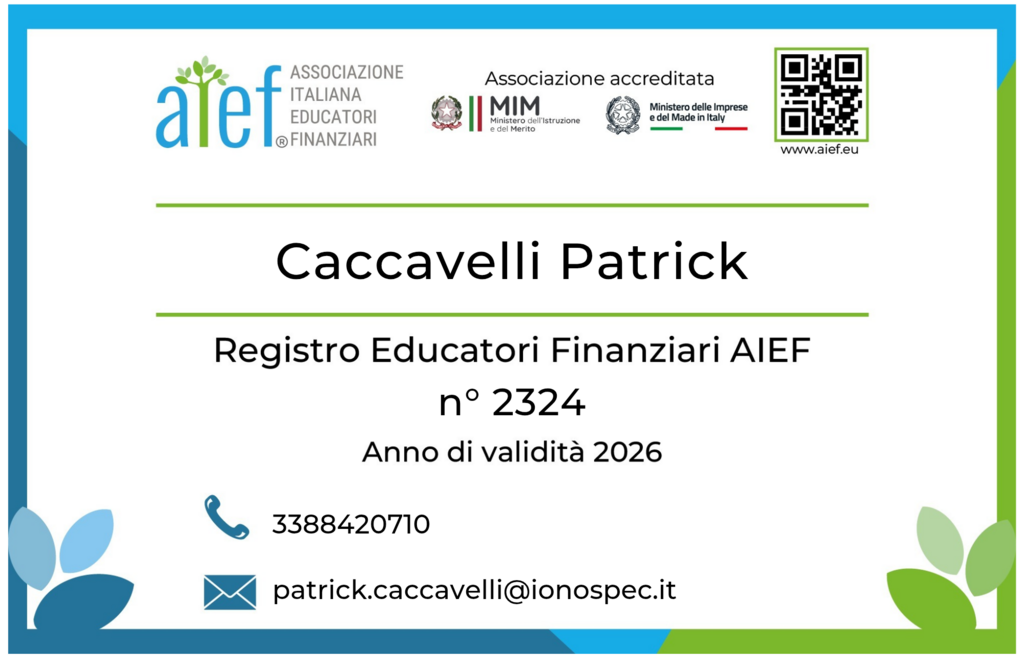 Patrick Caccavelli – Educatore Finanziario Certificato AIEF (Reg. Prof. ai sensi della Legge 4/2013).